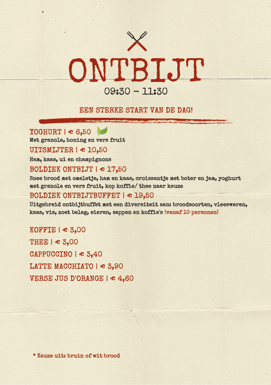 Op onze openingsdagen zijn wij geopend voor koffie met gebak en lunch. Naast het aanbod op onze menukaart hebben we wisselende dagverse warme en koude gerechten en broodjes.